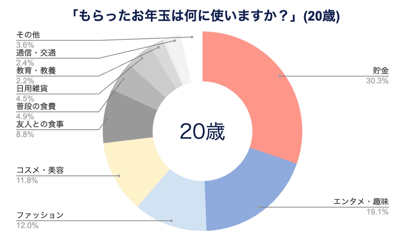 ・お年玉の使い道は、「貯金」が最も多く20歳で30.3%、18歳で26.5%、次いで「エンタメ・趣味」が20歳で19.1%、18歳で17.3%、「ファッション」が20歳で12.0%、18歳で15.0%だった。