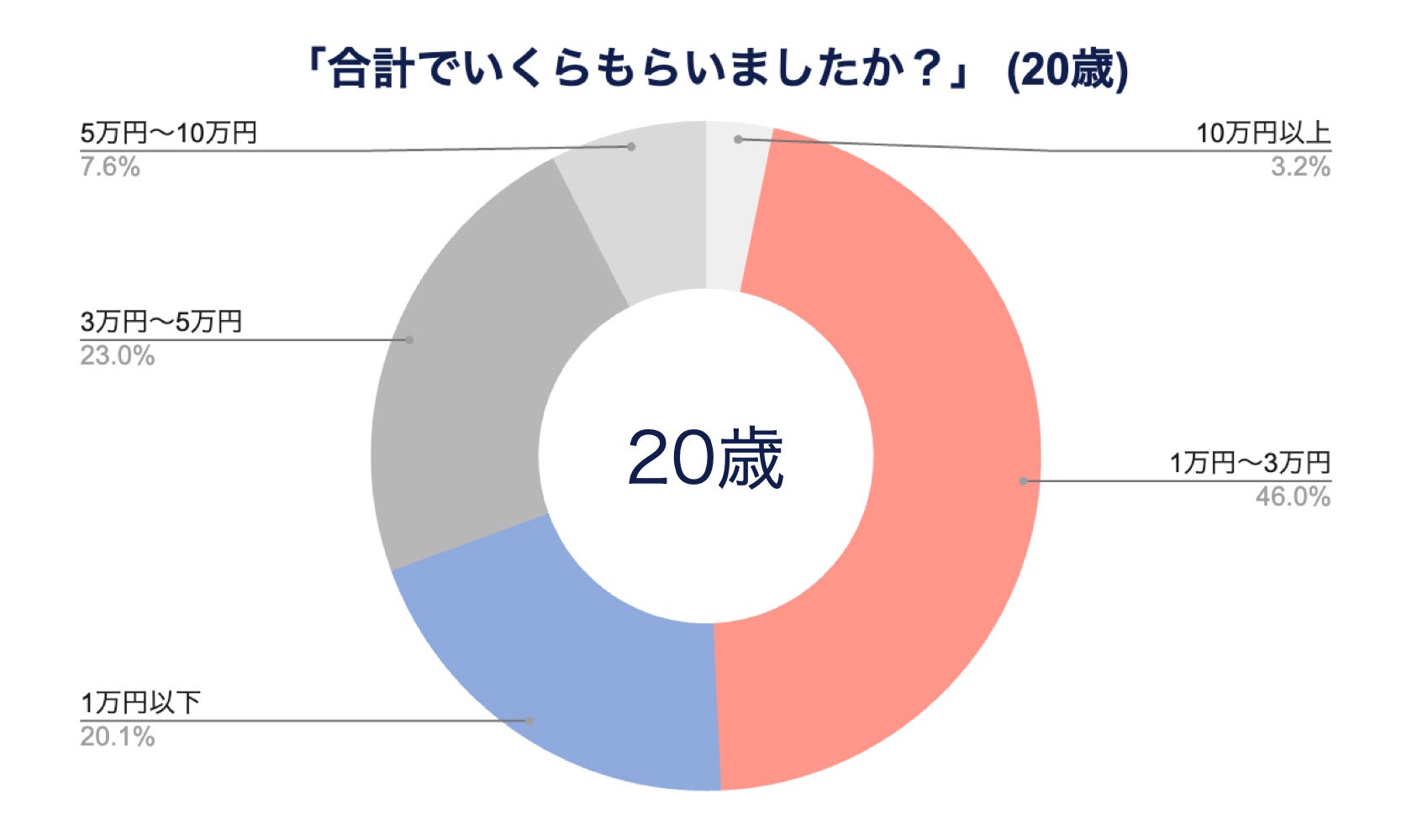 ・成人式を迎える20歳においては、お年玉をもらった人は62.9%で、金額は1万円〜3万円が46.0%で最多。10万円越えも3.2%おり、5万円以上もらった人は10.8%だった。