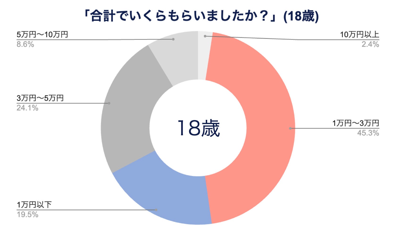 ・2022年4月からの成人年齢引き下げを受け、18歳を迎えた新成人のうち、お年玉をもらった人は77.1%で、金額は1万円〜3万円が45.3%で最多。10万円越えもおり、5万円以上もらった人は11%だった。