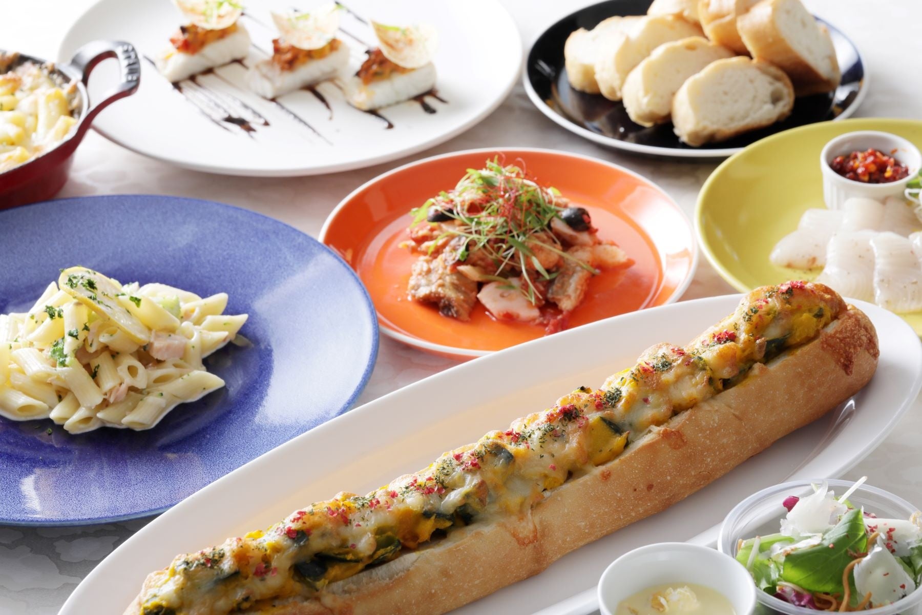 ■温製料理:南瓜サラダとロースハムのサンドイッチ/ふるふるポテトフライ(チリ&レモン風味、ケイジャンスパイス風味、カマンベール風味)/ツナと夏野菜 懐かしマカロニグラタン/鱸のオーブン焼き ラタトゥイユとジャガイモチップをのせて/豚ロース肉の低温ロースト 平成ハニーマスタードソース/ザ・フレンチ飯 牛肉のカルボナード ストリングス風厚切りバケットを添えて/ザ・イタ飯 サーモンとレモンの塩麹クリームペンネ/平成ビーフトマトカレー オニオンとアーモンドライスで