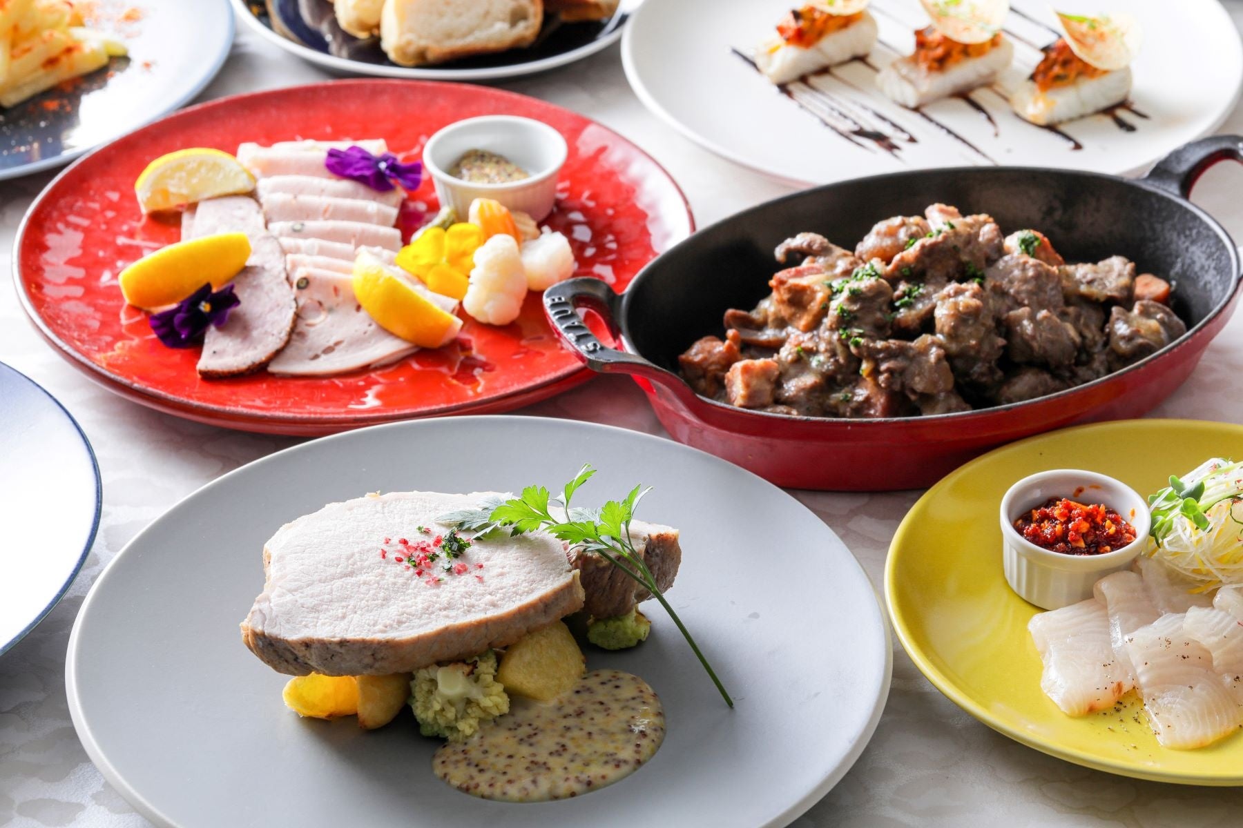 ■冷製料理:カンパチのマリネ 香味野菜と食べるラー油で/旬魚とタコのエスカベッシュ セロリとオリーブをのせて/2種のシャルキュトリーとピクルスの盛合わせ/完熟トマトとオレンジとナタデココのサラダ/愛知産のグリーンリーフサラダ ベイビィスタアとラスパドゥーラチーズ/つぶつぶコーンスープ