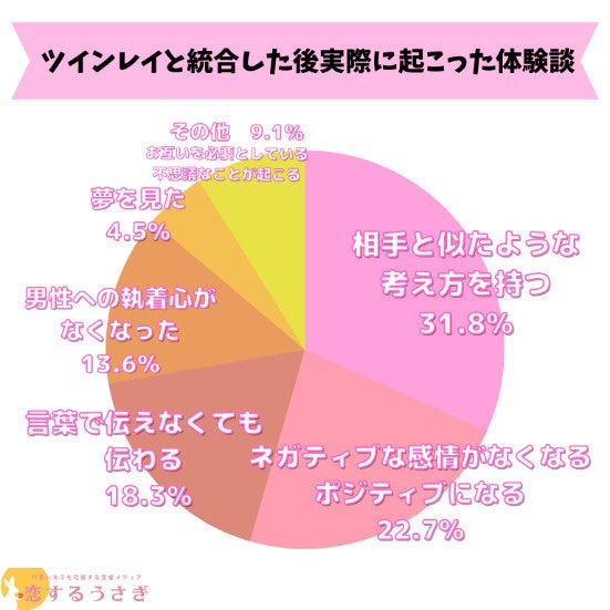 恋するうさぎ編集部が行った「ツインレイと統合した後実際に起こった体験談」のアンケートによると1位相手と似たような考え方を持つが31.8%、 2位はネガティブな感情がなくなる/ポジティブになるが22.7%、3位は言葉で伝えなくても伝わるが18.3%という結果になりました。