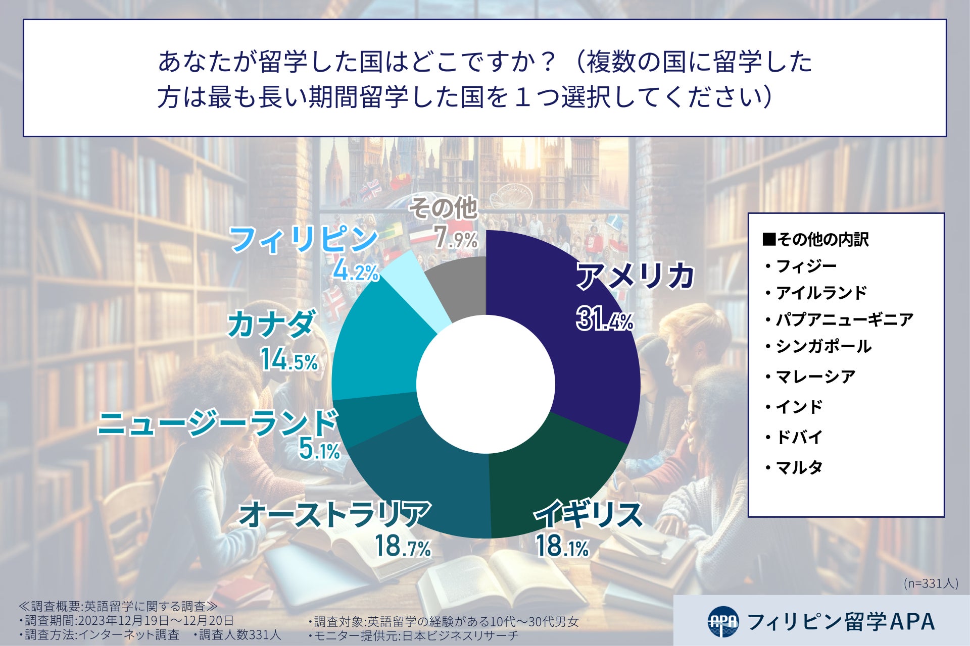 まず、調査対象となった英語留学経験者がどの国に留学していたのか、回答してもらった。