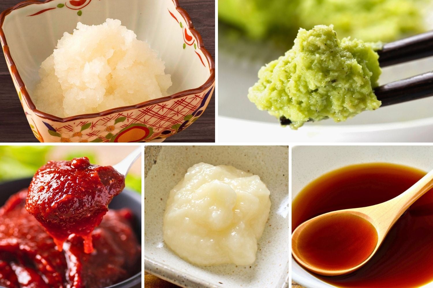 ラインナップ:大根おろし、わさび、コチュジャン、おろしニンニク、ポン酢。