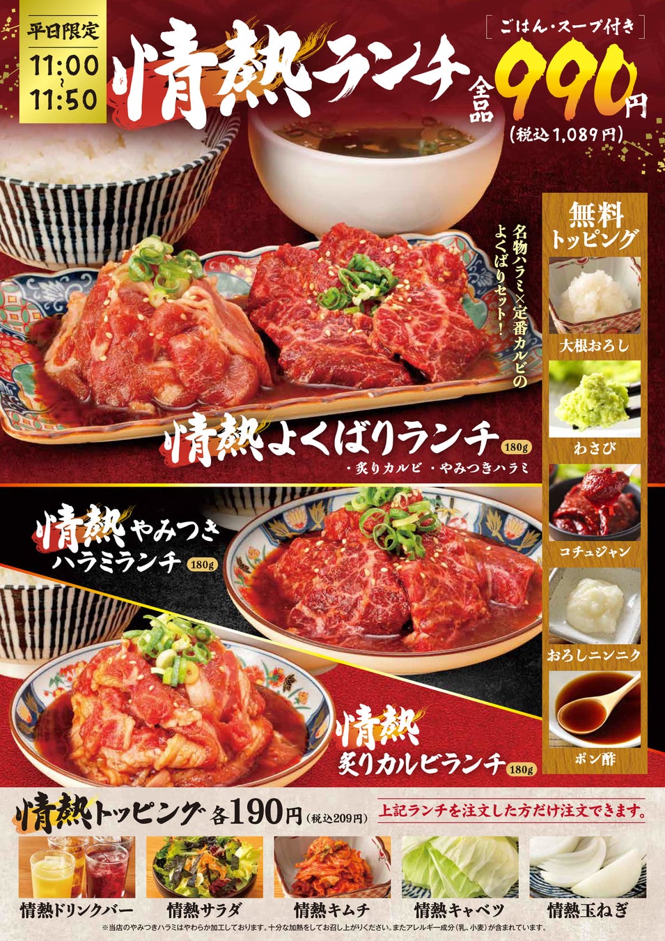 本シリーズは、平日11:00〜11:50の限定提供ながら、対象時間帯に来店するお客様の約8割が注文する大人気メニューとなっている。昨今の物価高騰を受け、「1,000円以内でお腹いっぱい焼肉を楽しみたい」というニーズに応えるべく開発。全品990円(税込1,089円)という価格に加え、ごはん・スープ付きの圧倒的なボリューム感が支持されている。