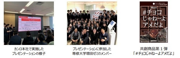 2021年から、マーケティング研究を専門とする専修大学増田ゼミと、「Z世代向けの飴(ハードキャンディ)の提案」をテーマにした取り組みがスタートした。学生からの企画提案やカンロの市場調査への協力のほか、2024年1月には共創第1弾の商品として「#チョコじゃねーよアメだよ」を発売し、産学連携の取り組みを推進している。